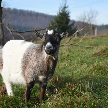 Chèvre miniature pie sauvage rouan aux yeux bleus, née le 21 mai 2019